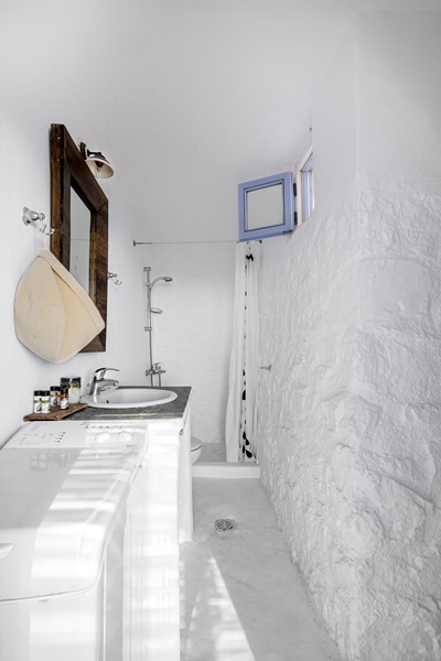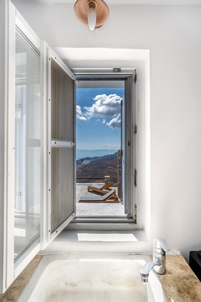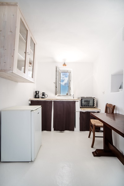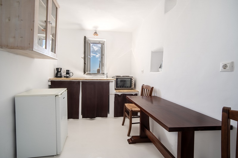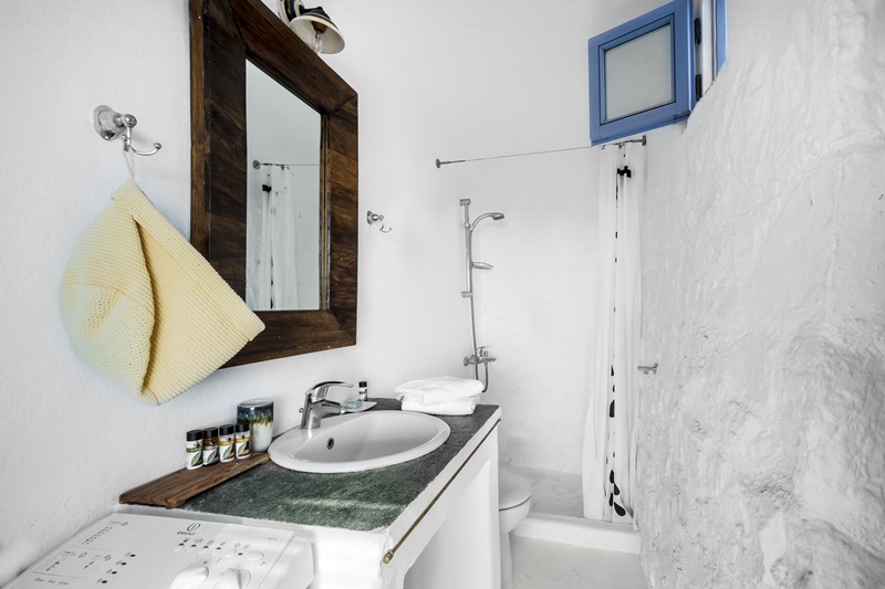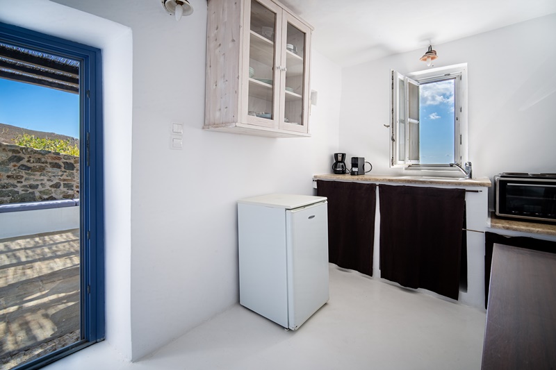 Une chambre avec un lit double, une salle de bain avec douche et une cuisine avec coin repas. Les trois zones sont accessibles par des portes extérieures, sur une véranda privée avec vue. La maison est juste au-dessus de la piscine partagée avec les autres maisons du complexe avec une vue imprenable.